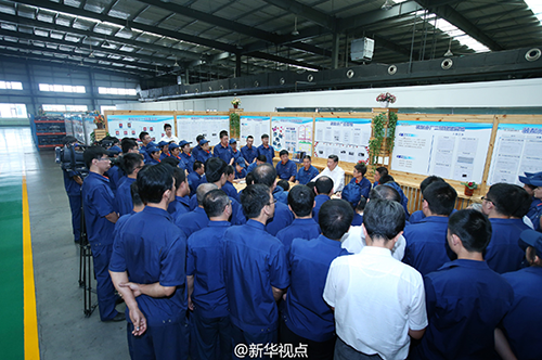 在裝配分廠一班和二班的班組園地,總書記同企業干部職工圍坐一起進行座談。習近平指出,中國夢具體到工業戰線就是加快推進新型工業化。把制造業搞上去,創新驅動發展是核心。我們要向全社會發出明確信息:搞好經濟、搞好企業、搞好國有企業,把實體經濟抓上去。