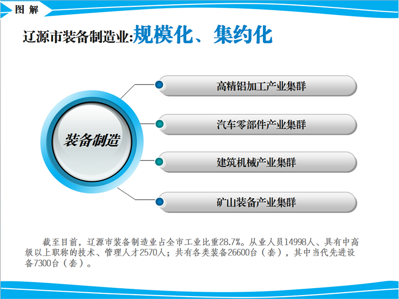 遼源市裝備制造業經過多年的建設與發展,現已呈現出產業集群規模化、集約化發展態勢。截至目前,遼源市裝備制造業占全市工業比重28.7%。從業人員14998人、具有中高級以上職稱的技術、管理人才2570人;共有各類裝備26600臺(套),其中當代先進設備7300臺(套)。